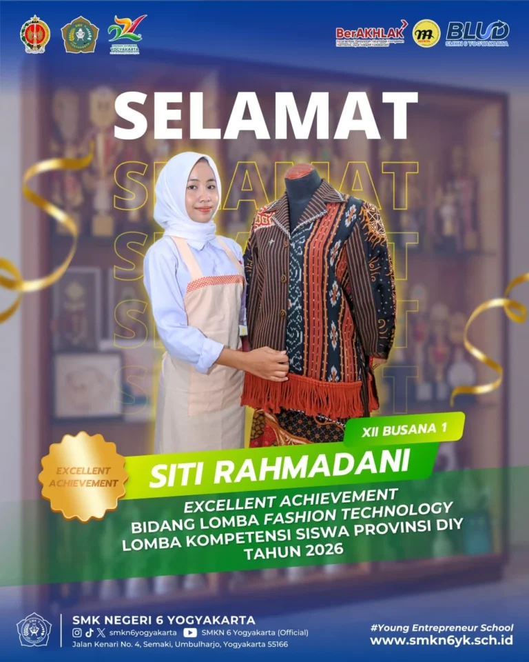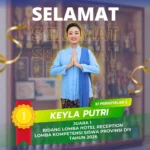 YOGYAKARTA – Semangat juara ditunjukkan oleh Keyla Putri, siswi kelas XI Perhotelan 2, yang sukses meraih Juara 1 dalam ajang LKS Tingkat Provinsi DIY 2026. Dalam kompetisi yang digelar pada 8-9 April tersebut, Keyla tampil sangat meyakinkan saat menghadapi berbagai simulasi pelayanan tamu di meja resepsionis.
